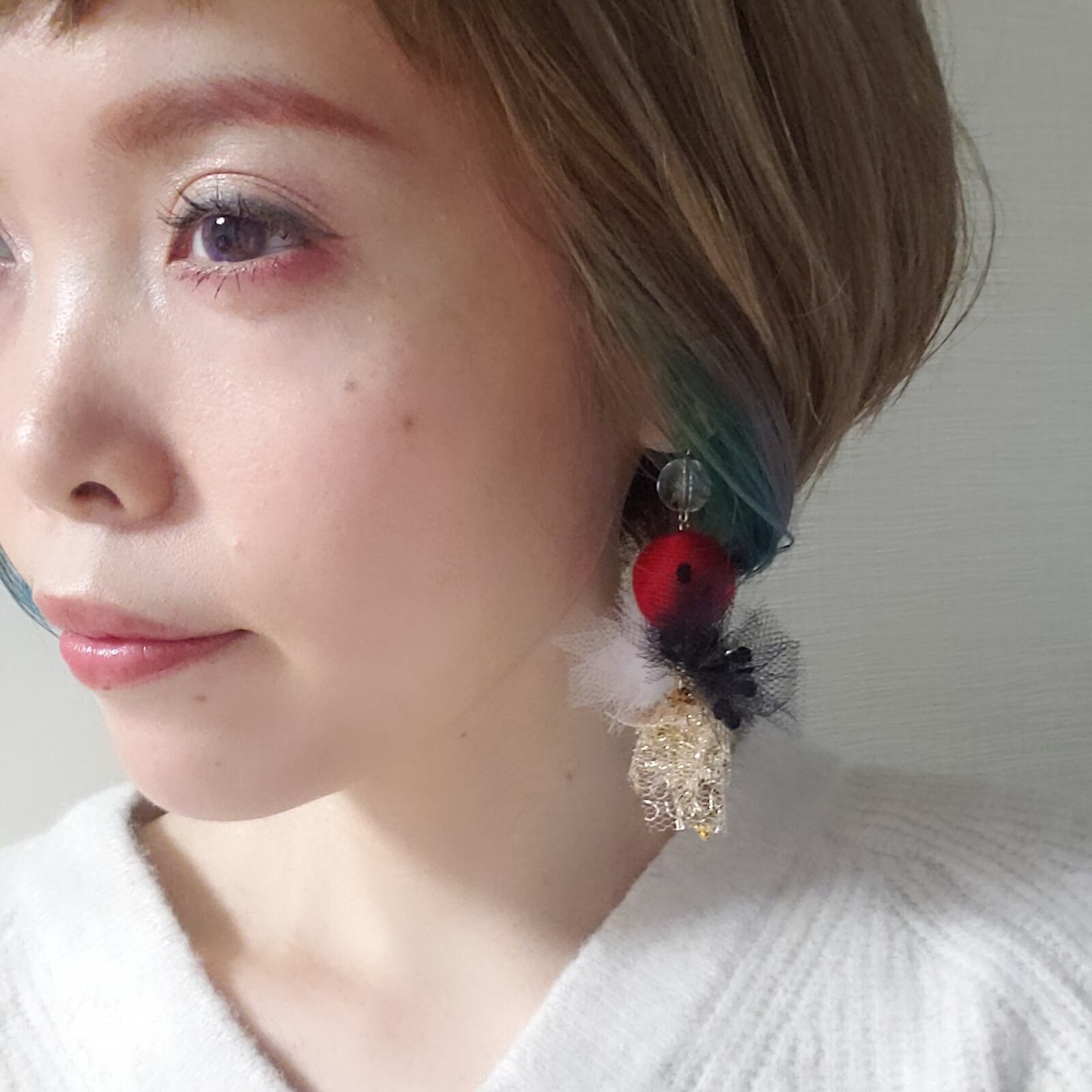 くるくる糸を巻いたパーツにチュールやレースを合わせたボリュームデザイン。
