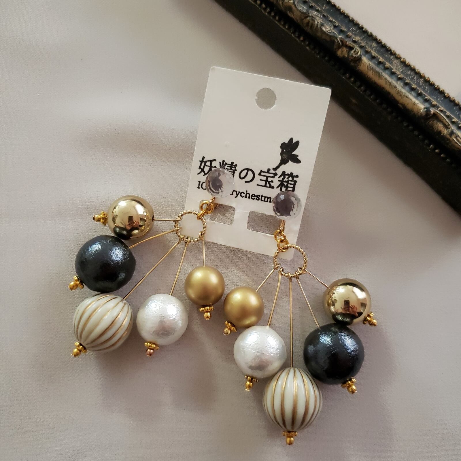 パール、アンティークパーツなどを合わせたボリュームデザイン。